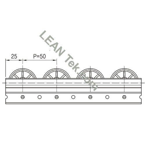 彈性體橡膠環保材質滾輪(TPU),具耐衝擊、耐曲折、高延伸性、高抗撕裂強度,以及耐低溫特性,冷軋鋼板翼樑寬度70mm,輪軸間距50mm,適用於滑動箱體單件重量在200kg(含)以內之無動力流道結構。