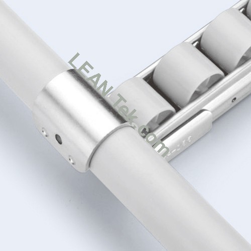 弧形滑出端連接件,與滾輪翼樑結合後,輪面高度會低於結構橫桿約一個管身,主要用於阻擋物品直接滑出結構,人員需取用時,可直接倚著連接件拉抬滑出,常用於店面料架結構。