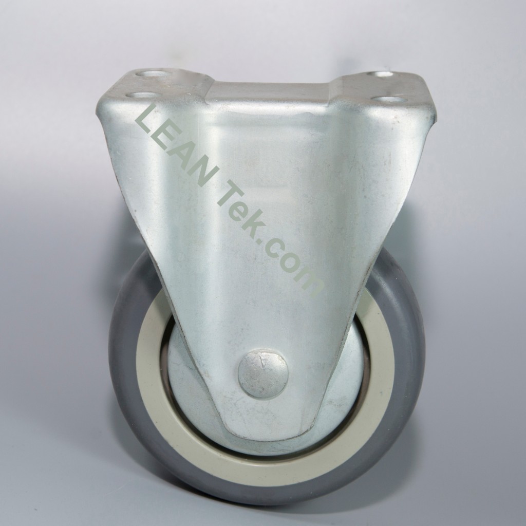5吋平板式TPR固定輪 ,用於載體在台車任一點荷重(非平均荷重))和輪子不露出於結構外,固定輪作雙向運動,鎖固時注意輪向位置。 搭配CM-200/230、電六角全牙螺絲、M8平華司、電尼龍螺帽、依情況選用塑膠滑夾使用。